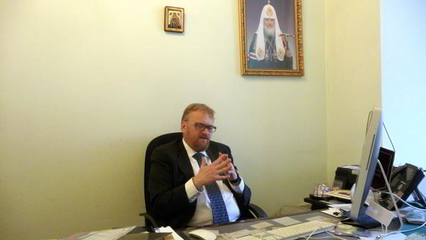 Le parlementaire nous reçoit dans son bureau, sous le portrait du patriarche de Moscou et de toute la Russie, un Vladimir Mikhailovich Gundyayev au regard sévère. Des icones décorent les murs et le bureau, où s’entassent pêle-mêle quantités de dossiers. Surnagent une bible et une église russe miniature en bois sombre. La présence de ces signes religieux ne tient pas du hasard. En effet, Vitaly Milonow ne cache pas que son action politique est fortement influencée par la religion orthodoxe en plein renouveau dans la Russie de Vladimir Poutine.