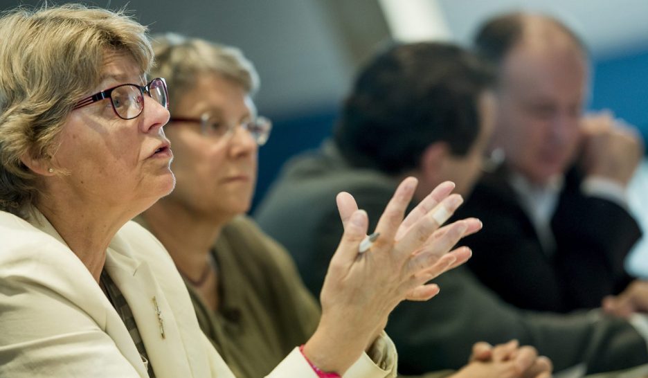 Depuis la gauche, Claudine Wyssa, Présidente de l'Union des Communes Vaudoises, UCV, avec les conseillers d'Etat vaudois Béatrice Metraux, Pascal Broulis et Pierre-Yves Maillard, lors d'une conférence de presse sur les négociations financières entre l'Etat de Vaud et les communes vaudoise, juin 2013. KEYSTONEFiscalité des entreprises