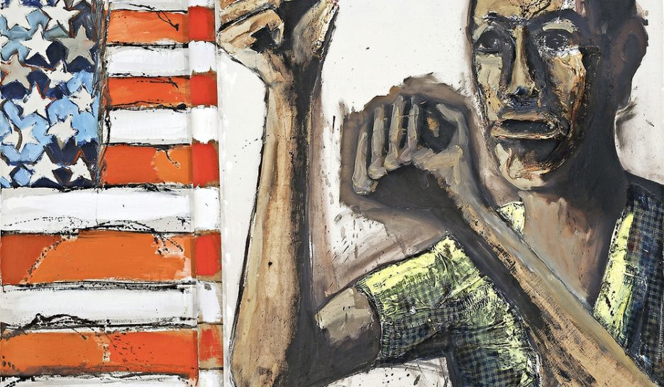 le poing levé a été brandi dans plusieurs œuvres fortes, dont celle de l'artises Benny Andrews "Did the bear sit under a tree?" (1969), FINE ARTS MUSEUMS OF SAN FRANCISCOBlack Power