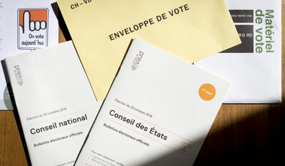 Le matériel de vote (enveloppe, bulletins) du canton de Vaud pour les élections fédérales d’octobre 2019. Photo d'illustration. KeystoneDroits politiques