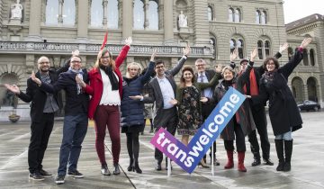 En 2018, Transgender Network (TGNS) lançait auprès des entreprises une campagne de sensibilisation à la discrimination des personnes trangenres au travail. Ici sur la place fédérale à Berne avec des élus. KEYSTONETransidentité