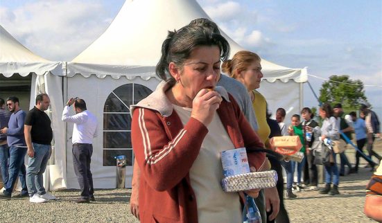 A ce moment, un groupe de jeunes hommes est entré dans la tente et a commencé à embrasser le corps sans vie de Têmûr l’un après l’autre. Que pourrait-on faire face à un tel chagrin? Quand j’ai regardé Sevag, j’ai remarqué qu’il avait cessé de filmer, les yeux rougis par les pleurs. Sevag est un jeune artiste arménien (photographe). Nous avons fait connaissance à Stepanakert, la capitale de l’Artsakh (Haut-Karabakh). Je le voyais toujours pleurer à chaque enterrement où nous allions. C’est là que j’ai réalisé que la douleur n’a pas d’identité.