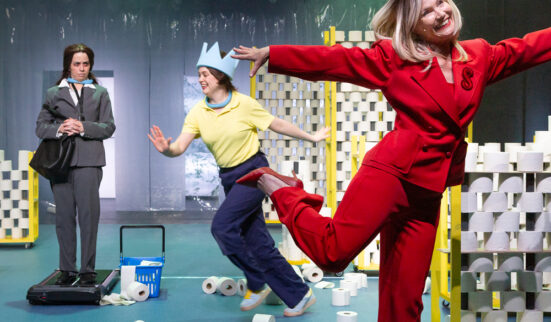 La metteure en scène et directrice du Théâtre populaire romand de La Chaux-de-Fonds s’intéresse cette fois-ci à l’hétéronormativité au temps du rêve américain, tout en la questionnant habilement aujourd’hui. La langue, vulgaire et féroce, a pris un coup de jeune dans la version du texte traduit par Daniel Loayza (2012). Elle touche le public avec une acuité d’autant plus grande que celui-ci est aussi pris à partie dans le «théâtre dans le théâtre» voulu par Anne Bisang. Le jeu est donc ici double. C’est celui, cruel et destructeur, auquel Marta et George se livrent, en conviant Nick et Honey à y participer. C’est aussi le jeu des acteur·trices en train de jouer leur propre rôle depuis les coulisses du Poche, dont les portes, ouvertes en fond de scène, donnent directement sur le décor du salon bourgeois.