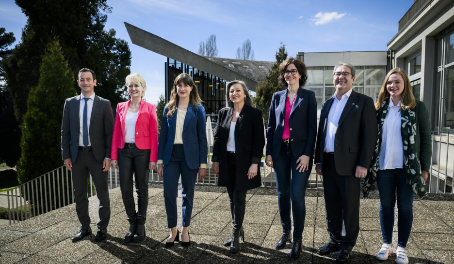 Le nouveau Gouvernement vaudois avec, de gauche à droite: Vassilis Venizelos, Isabelle Moret, Rebecca Ruiz, Nuria Gorrite, Christelle Luisier, Frederic Borloz et Valerie Dittli. KEYSTONEElections cantonales vaudoises