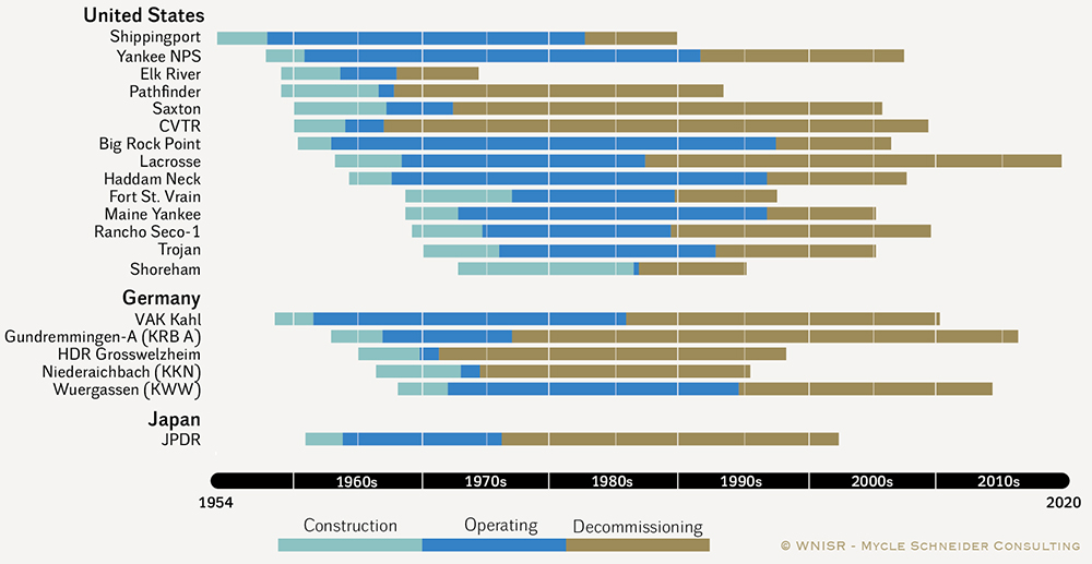Du coût de l’«élimination» des déchets nucléaires. C’est généralement la première et, malheureusement, souvent la seule question que se posent les politiques dans ce contexte. Ben Wealer, économiste à l’Université technique de Berlin, a rappelé que dans le monde entier, aucune centrale nucléaire de taille standard ayant fonctionné pendant plus de 40 ans n’avait encore été entièrement démantelée à ce jour. Il n’existe donc aujourd’hui pratiquement aucune valeur indicative pour l’estimation des coûts de démantèlement, et les exploitants devraient constituer des provisions d’un montant inconnu. Le graphique ci-dessous présente une compilation de toutes les installations entièrement démantelées dans le monde. La majorité de ces usines étaient de petites installations pilotes. On constate que, pour la plupart d’entre elles, la phase de démantèlement a souvent duré beaucoup plus longtemps que la construction et l’exploitation réunies.