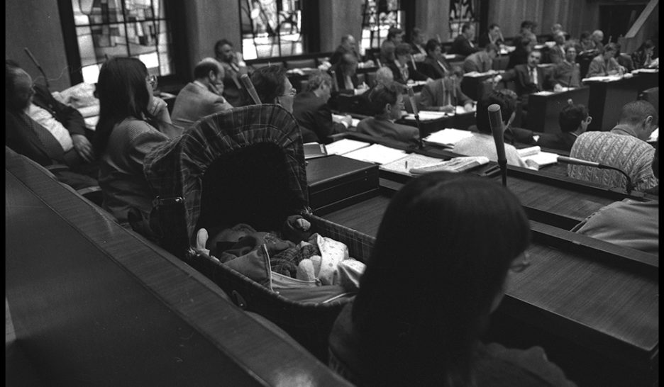 Un bébé lors de la séance du Municipal consacrée au budget 1995. Michèle Künzler, élue verte et future conseillère d’Etat, est venue en séance