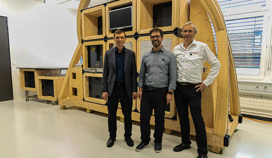 Pierre-Yves Burgi, Jérôme Charmet et Florian Serex posent devant le MicroLean Lab. DRNouvelles technologies