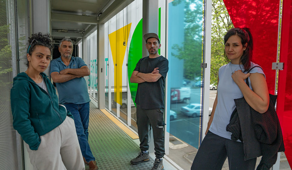 La comédienne Yasmin Shalaldeh, le directeur technique Adnan Naghnaghiye, Ahmed Tobasi et la comédienne Nisbat Serhan lors des répétitions au Théâtre de Vidy-Lausanne. GILLES VUISSOZReportage