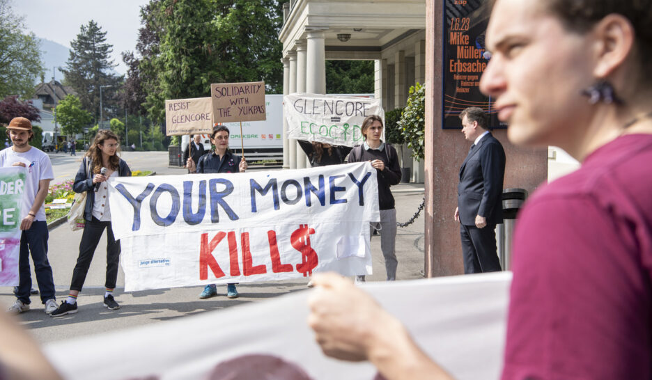 Des militant·es devant le Casino de Zoug à l’occasion de l’assemblée générale de Glencore en 2023. KEYSTONEMultinationales