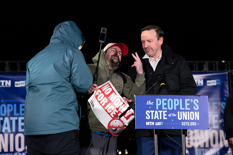 Le sénateur du Connecticut Chris Murphy a estimé que Donald Trump «se moque de cette grande institution (le Congrès) et ne mérite pas de public». Il est rejoint par un manifestant anti-Trump. KEYSTONEÉtats-Unis