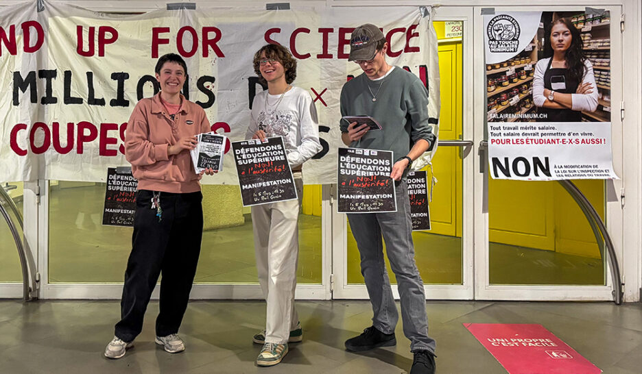 A Uni Mail, ce mercredi, une poignée d’étudiant·es étaient réuni·es à l’appel de la Conférence universitaire des associations d’étudiant·es (CUAE) pour interrompre des cours et bloquer des auditoires durant 22 minutes et 30 secondes. L’action, qui s’est déroulée dans le calme en début d’après-midi, visait à dénoncer la possible baisse de 25% du salaire minimum […]