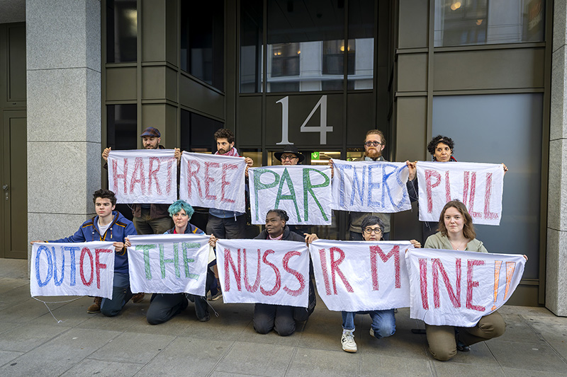 Une délégation du peuple autochtone Sami a manifesté devant le siège genevois de Hartree Partners pour protester contre le projet d’une mine de cuivre en Norvège.